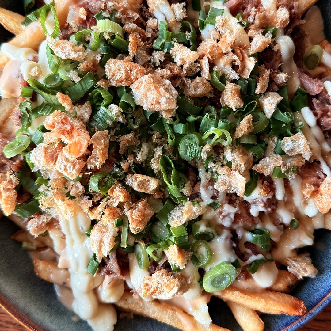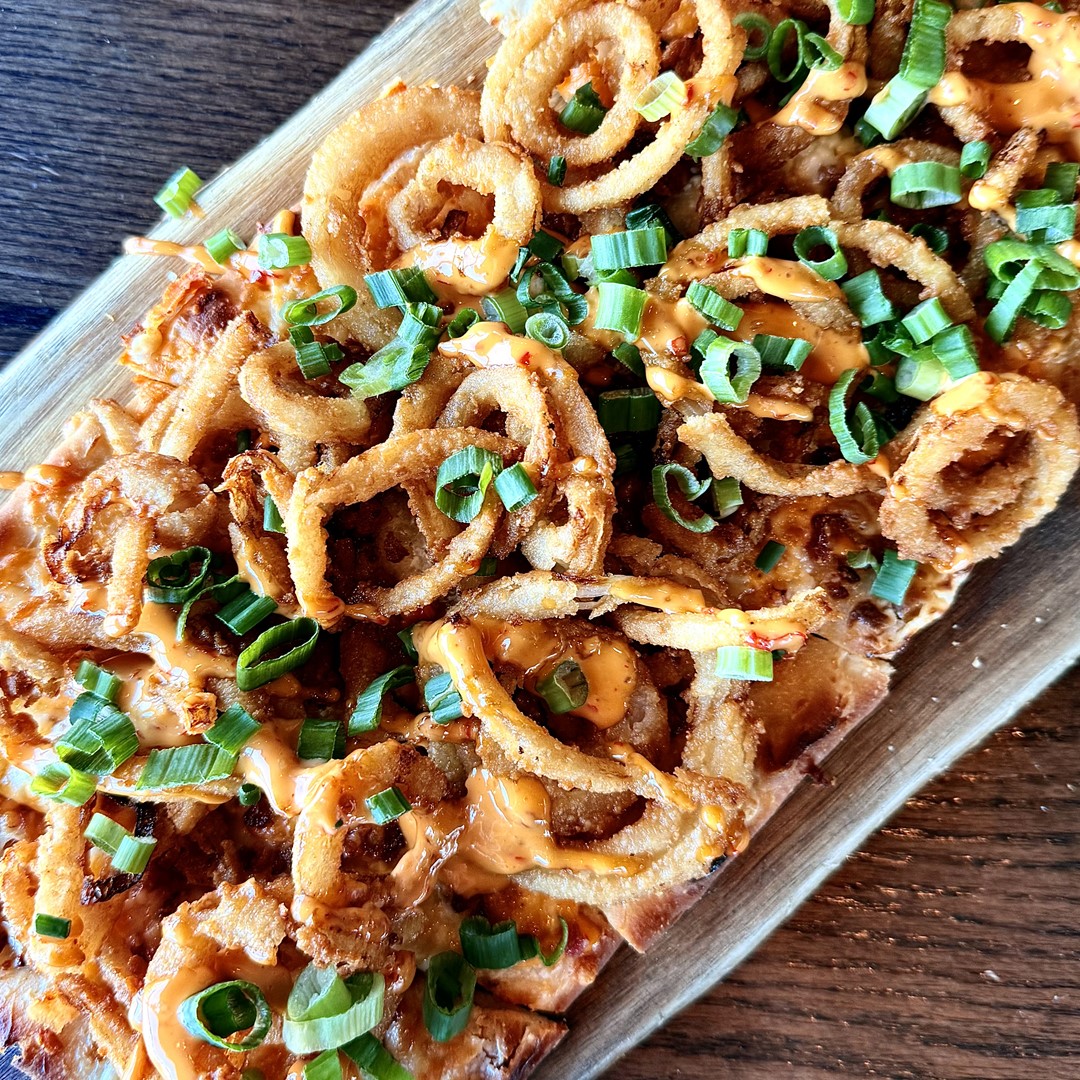 Sushi Taco- Served in a tempura sea weed shell with sushi rice, avocado, deep fried fish, spicy mayo & green onions. Topped with house made pickled onion bob balls.